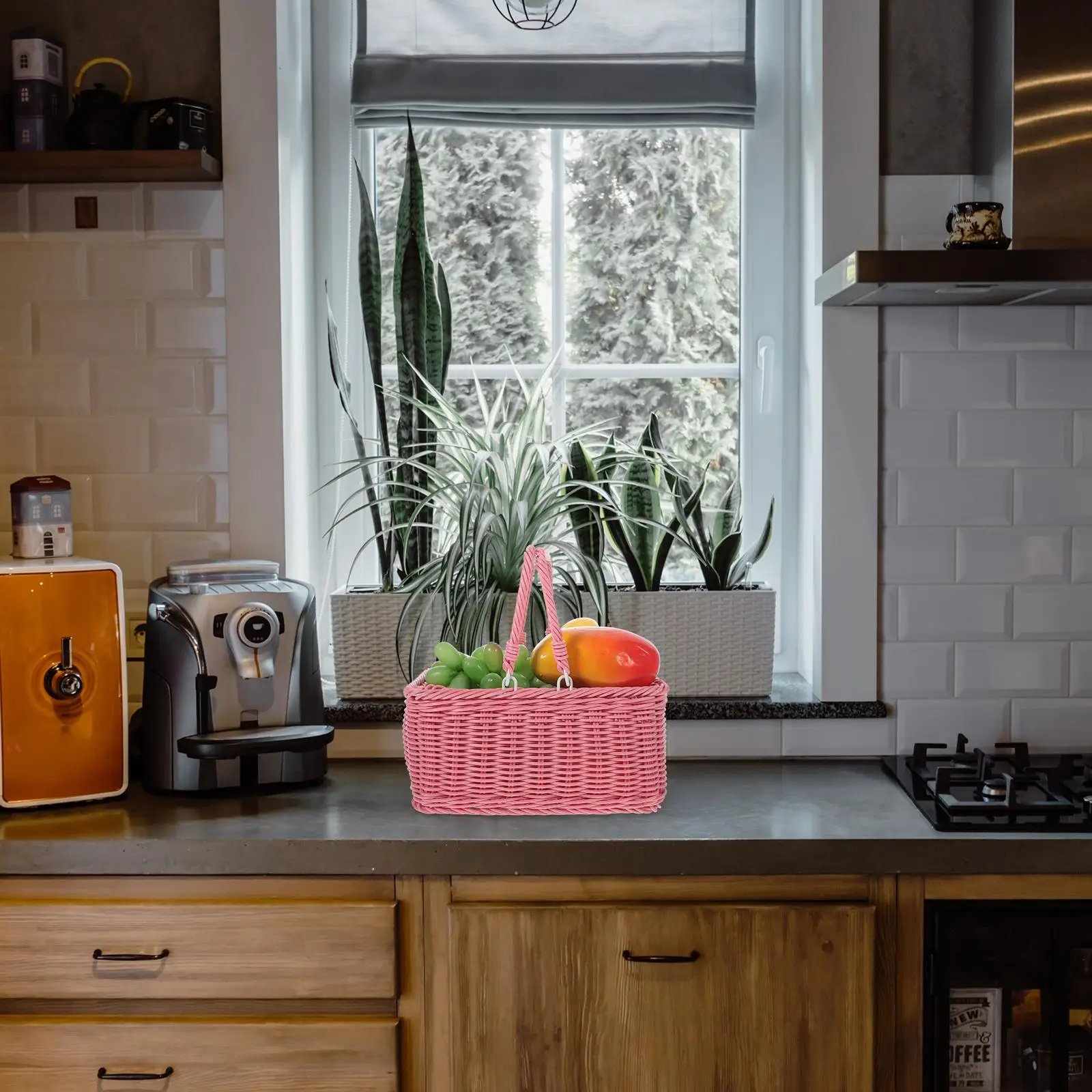 Picnic Basket Handmade Woven Baskets Pink Rectangular Fruit Vegetable Dessert Snacks Holder Practical Rustic Style
